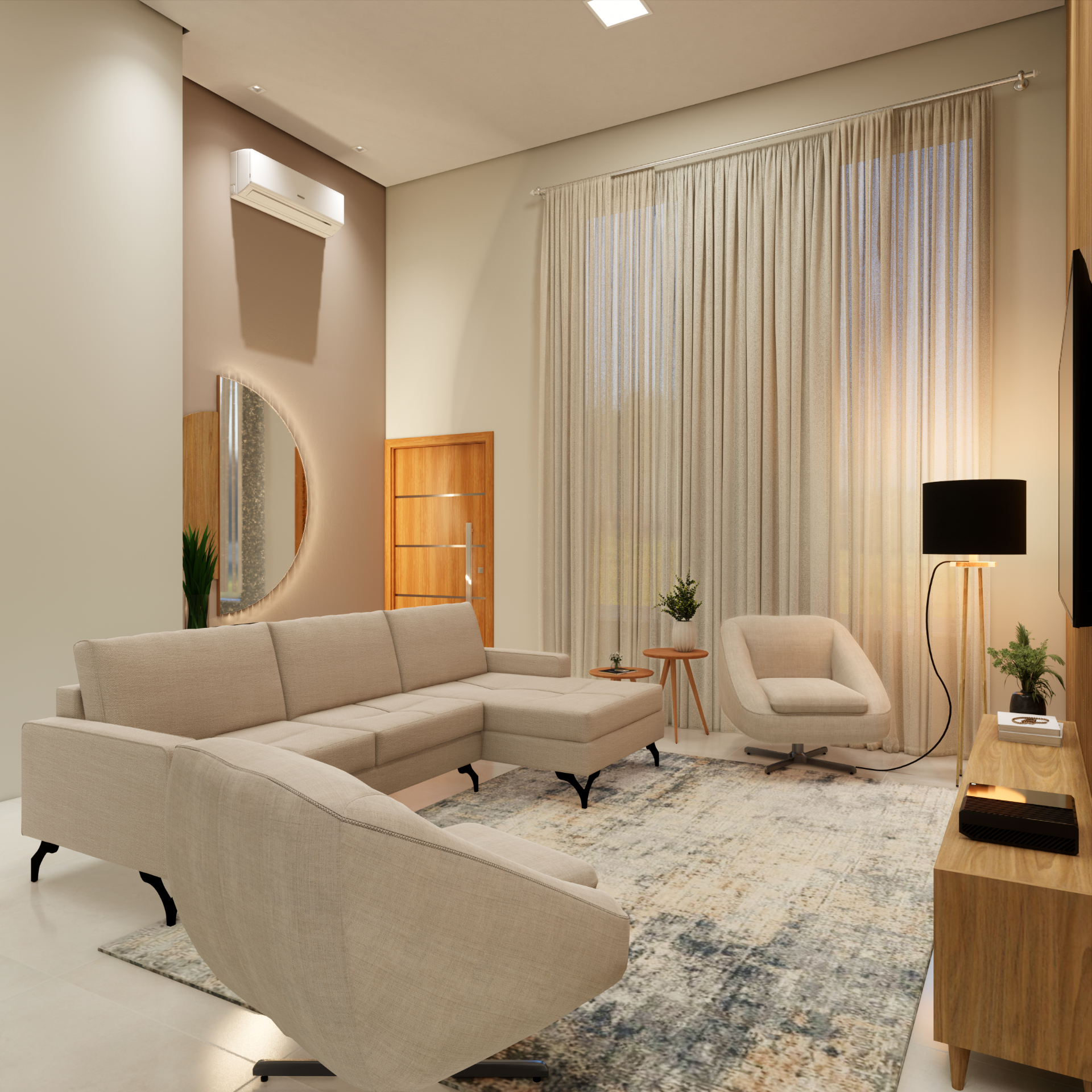 Aplicando conceitos de Neuroarquitetura. deixei esse ambiente acolhedor, seguro, com cores claras, amadeirado e uma iluminação própria para o ambiente da tv..